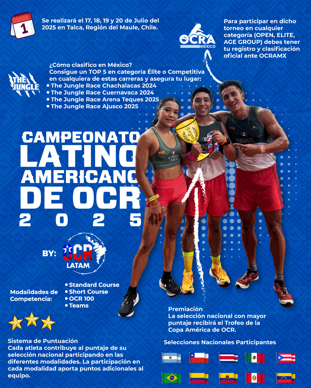 En el Campeonato Latinoamericano de OCR se tendrá la participación de competidores de Argentina, Bolivia, Brasil, Chile, Colombia, Costa Rica, Ecuador, México, Perú, Puerto Rico, Venezuela y el anfitrión, Chile, quiendes estará a la búsqueda del trofeo de la Copa América de OCR y de boletos para el Mundial de Suecia 2025.