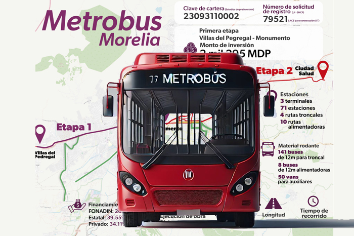 De acuerdo a los reportes proporcionados por el mandatario estatal, Alfredo Ramírez Bedolla, el Metrobus de Morelia iniciará su construcción en julio del 2025 y está proyectado a terminarse en el mes de diciembre del año posterior.