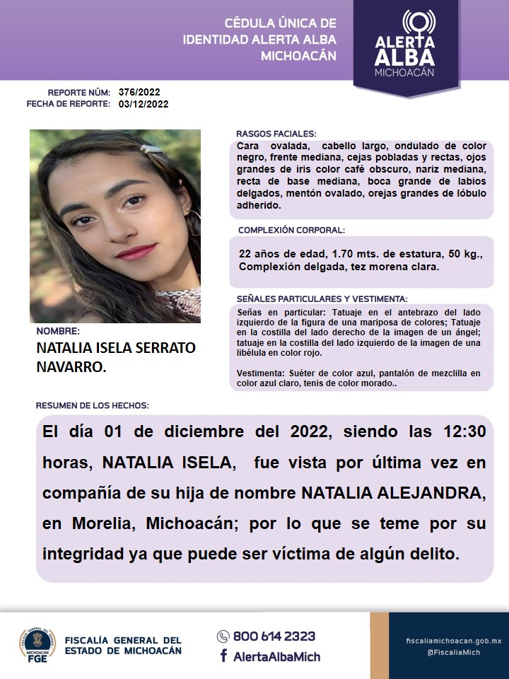Asimismo, en Morelia, una joven mamá de nombre Natalia Isela Serrato y su pequeña hija de tan solo 4 años de edad, desaparecieron desde el pasado primero de diciembre.